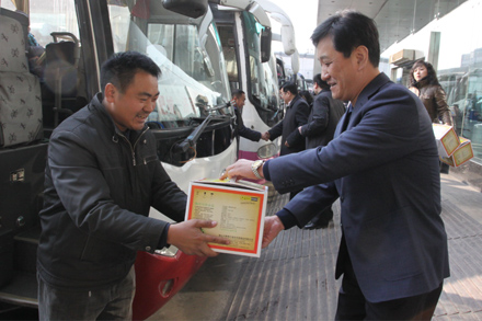 2月2日是大年三十,下午兩點(diǎn)鐘,集團(tuán)公司領(lǐng)導(dǎo)來(lái)到總站南北兩區(qū),走訪看望車(chē)站干部職工,歡送春運(yùn)末班車(chē),并向駕乘人員贈(zèng)送了春節(jié)紀(jì)念品。在總站候車(chē)大廳,吳宗昌董事長(zhǎng)簡(jiǎn)要回顧了節(jié)前春運(yùn)的整體情況,感謝大家春運(yùn)期間的辛勤工作,代表領(lǐng)導(dǎo)班子向所有干部職工拜年,并與車(chē)站干部職工合影留念。來(lái)到發(fā)車(chē)區(qū),吳宗昌董事長(zhǎng)、王謙總經(jīng)理帶領(lǐng)集團(tuán)公司領(lǐng)導(dǎo)班子分別慰問(wèn)了春運(yùn)末班車(chē)的駕乘人員,贈(zèng)送了春節(jié)紀(jì)念品,并囑咐他們開(kāi)好最后一班車(chē),把旅客安全送回家。