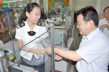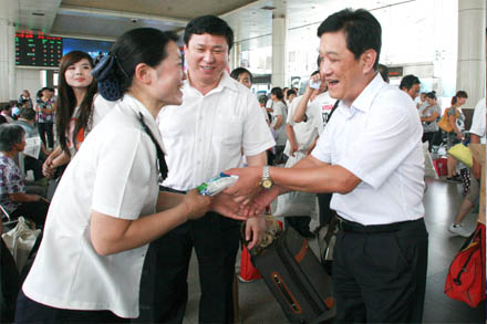 王謙總經理來到總站報班處,向堅守工作崗位的工作人員表示慰問,把冰糕、礦泉水一一送到他們手中。在發車區,看到濟宇高速的駕駛員時,王總叮囑他要注意高溫下的行車安全,保證讓旅客有一個清涼、舒適的旅途環境。王總還與客車的乘務人員親切交談,了解暑期運輸中客流的變化情況,囑咐大家克服高溫帶來的不利因素,竭盡全力為旅客提供各類服務。