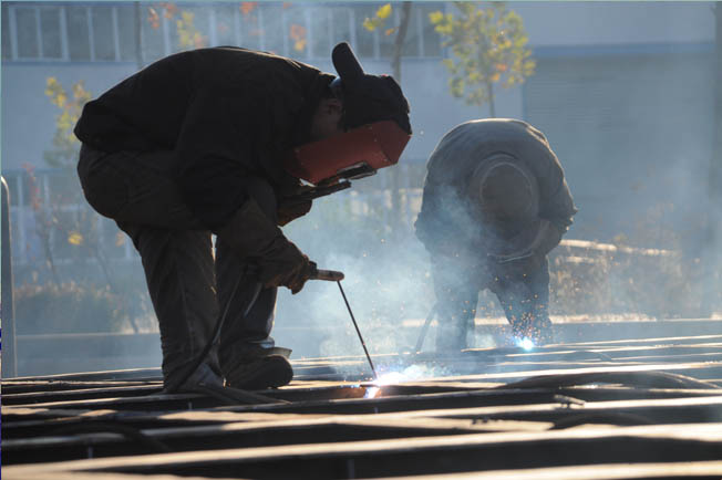 在濟(jì)宇汽車修理車間采訪小組成員在現(xiàn)場(chǎng)進(jìn)行采訪、拍攝