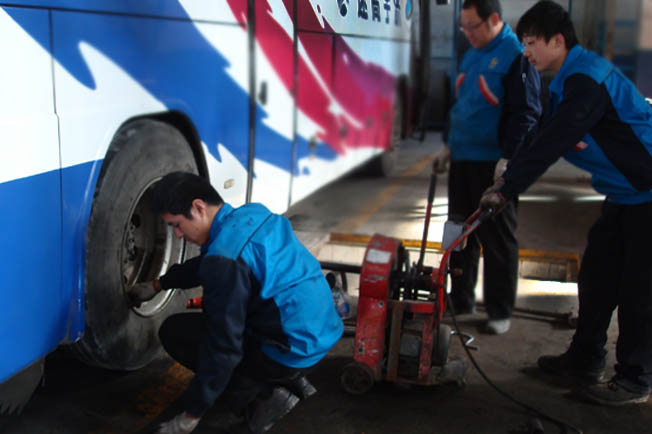在汽車保修廠檢測(cè)線采訪小組觀看了班車安全檢測(cè)的全過程