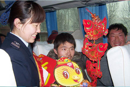 今年春運(yùn)期間,山東交運(yùn)集團(tuán)提前八天進(jìn)入了春運(yùn)狀態(tài),汽車東站根據(jù)今年農(nóng)民工返鄉(xiāng)運(yùn)輸仍將增長的需求,多措并舉,提前部署安排民工返鄉(xiāng)運(yùn)輸工作,組織人員及時(shí)走訪各類建筑工地調(diào)查摸底,統(tǒng)計(jì)包車線路,發(fā)放班車時(shí)刻信息表,宣傳班次信息,結(jié)合農(nóng)民工集中返鄉(xiāng)的需求,確定返鄉(xiāng)時(shí)間和線路。并在包車當(dāng)日將車站的優(yōu)質(zhì)服務(wù)帶到了建筑工地,宣傳乘車注意事項(xiàng),幫助農(nóng)民工朋友調(diào)試座椅、系好安全帶,發(fā)放暖手寶驅(qū)除嚴(yán)寒。身披綬帶的服務(wù)人員還為他們送上了福字、對聯(lián)、賀歲吉祥物等新春禮品。并現(xiàn)場辦理了免費(fèi)行包托運(yùn),讓農(nóng)民工朋友返鄉(xiāng)一路無憂。