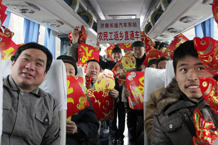 不排隊(duì),不上網(wǎng),不用提著大包小包到處跑,孩子不受擠,老人不遭罪,車到門口抬腿就能走,這是多少人春運(yùn)回家的夢想。2013年1月26日,全國春運(yùn)第一天,濟(jì)南市建設(shè)路附近的建筑工地上,來自山東滕州的30多位農(nóng)民工朋友就提前實(shí)現(xiàn)了這個(gè)夢想。