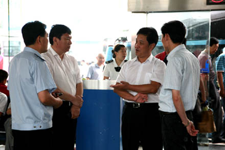 您現在的位置是:首頁 > 集團要聞 吳董事長冒雨視察端午節旅客運輸工作 次 集團要聞 發布時間:2013-06-10 15:25:17 吳董事長冒雨視察端午節旅客運輸工作 6月10日,端午小長假的第一天,集團公司吳宗昌董事長一早冒雨來到濟南長途汽車總站,現場視察端午節旅客運輸工作。并與總站站長、客運公司經理、安保部部長等相關負責人就節日運輸旅客服務工作、安全保障工作、運力準備情況、客流動態等進行了詳細了解。于此同時,吳董事長還對總站剛剛設立的交通郵政戰略合作示范點進行了現場指導。吳董事長對集團各單位高效完備的節日運輸保障機制以及安全有序的運營秩序表示滿意。 (總站宣)