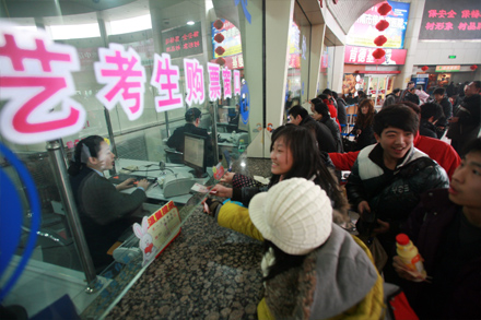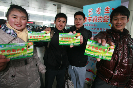 在售票處,總站專門 為增設了“藝考生購票窗口”,就青島、濰坊、淄博、曲阜等藝考線路,向藝考生提供優惠和優先的購票服務。為方便眾多藝考生在多個考點城市中轉乘車,總站還在藝考生中轉趕考集中的43號檢票口,特別設立了“藝考生服務臺”,并推出預約乘車、送藝考生趕考的便捷服務,藝考生只需憑借準考證,即可享受優先預訂中轉客票、優先乘車的“預約趕考服務”