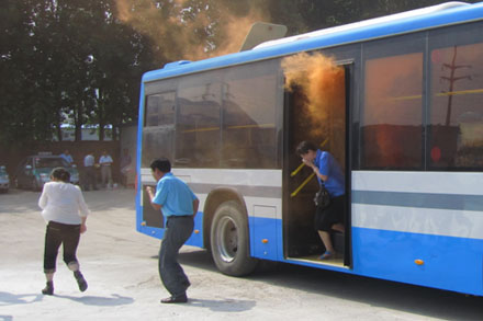 此次綜合應(yīng)急演練共設(shè)置了“三品檢查”、“處理突發(fā)事件”、“逃生應(yīng)急演練”、“ 心肺復(fù)蘇救護(hù)演示”、“消防滅火”和“防汛搶險(xiǎn)救災(zāi)”等多個(gè)演練科目。三品檢查模擬了乘務(wù)員對上車乘客依次進(jìn)行攜帶物品檢查,對發(fā)現(xiàn)的汽油等易燃品及時(shí)進(jìn)行處理,禁止乘客登乘;處理突發(fā)事件模擬了一名精神病患者在客運(yùn)站人員密集場所拿棍棒滋事,針對這一突發(fā)事件,場站工作人員迅速報(bào)警并采取果斷行動,用鋼叉等工具制服滋事者并移送公安機(jī)關(guān),有效保障了乘客的人身安全;逃生應(yīng)急演練由區(qū)交通局工作人員講解安全錘的正確使用,然后釋放煙霧模擬車輛發(fā)生火災(zāi),乘客用毛巾等物品捂住口鼻防止嗆傷,駕駛員組織乘客有序逃離起火車輛,并立即撥打119報(bào)警求助;心肺復(fù)蘇救護(hù)詳細(xì)的演示了救護(hù)員對患者從最初的病情判斷、清除口鼻異物、人工呼吸、胸外按壓等一系列動作;消防演練模擬了在汽車站突然發(fā)生的一場由廢棄燃料引發(fā)的火災(zāi),現(xiàn)場工作人員立即啟動應(yīng)急預(yù)案,滅火小組迅速展開行動,手持滅火器將火災(zāi)及時(shí)撲滅;防汛演練模擬汛情發(fā)生后,應(yīng)急預(yù)案立即啟動,迅速集合搶險(xiǎn)救災(zāi)車輛、物資和人員,快而有序地派往汛情發(fā)生地。
